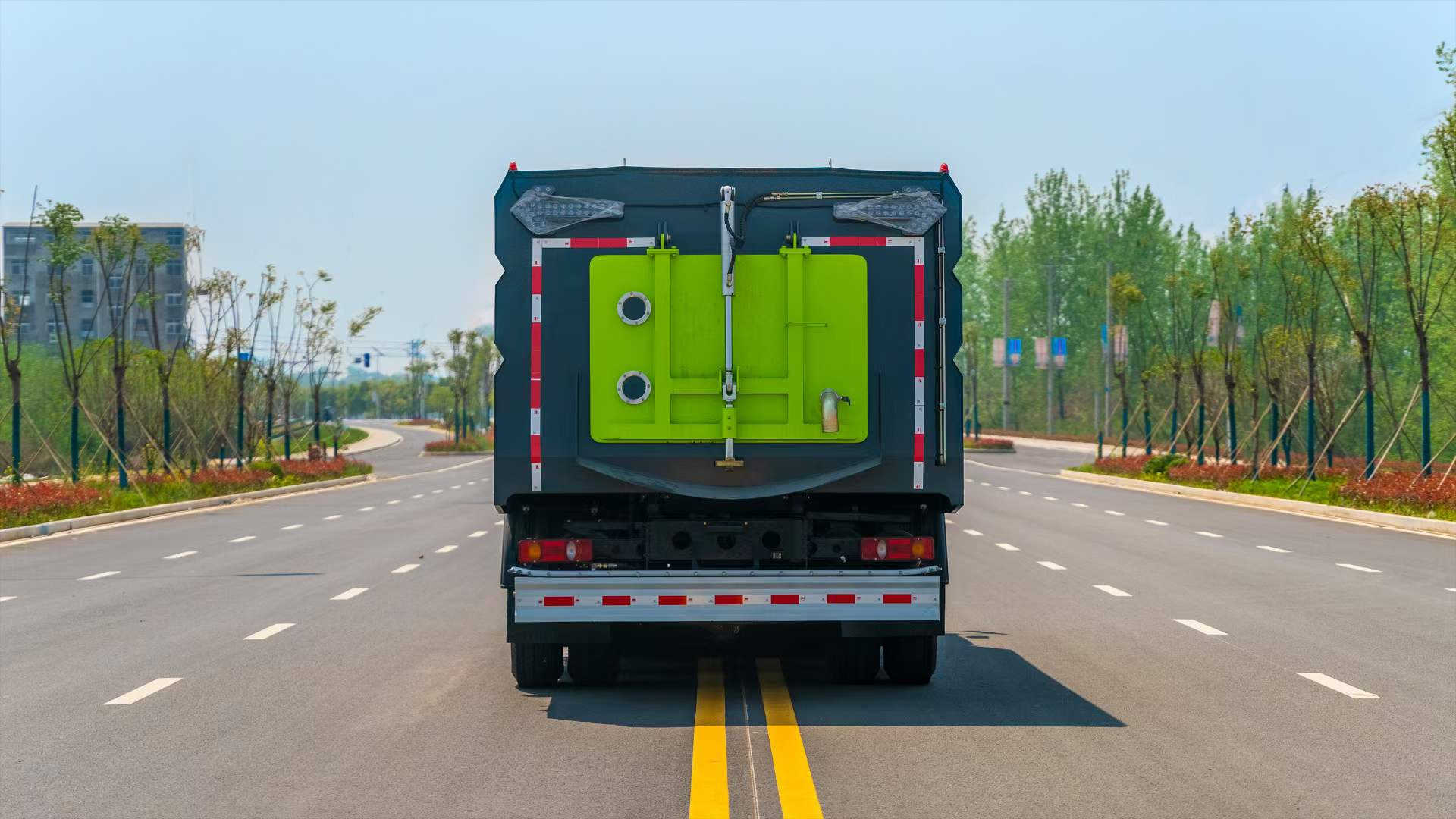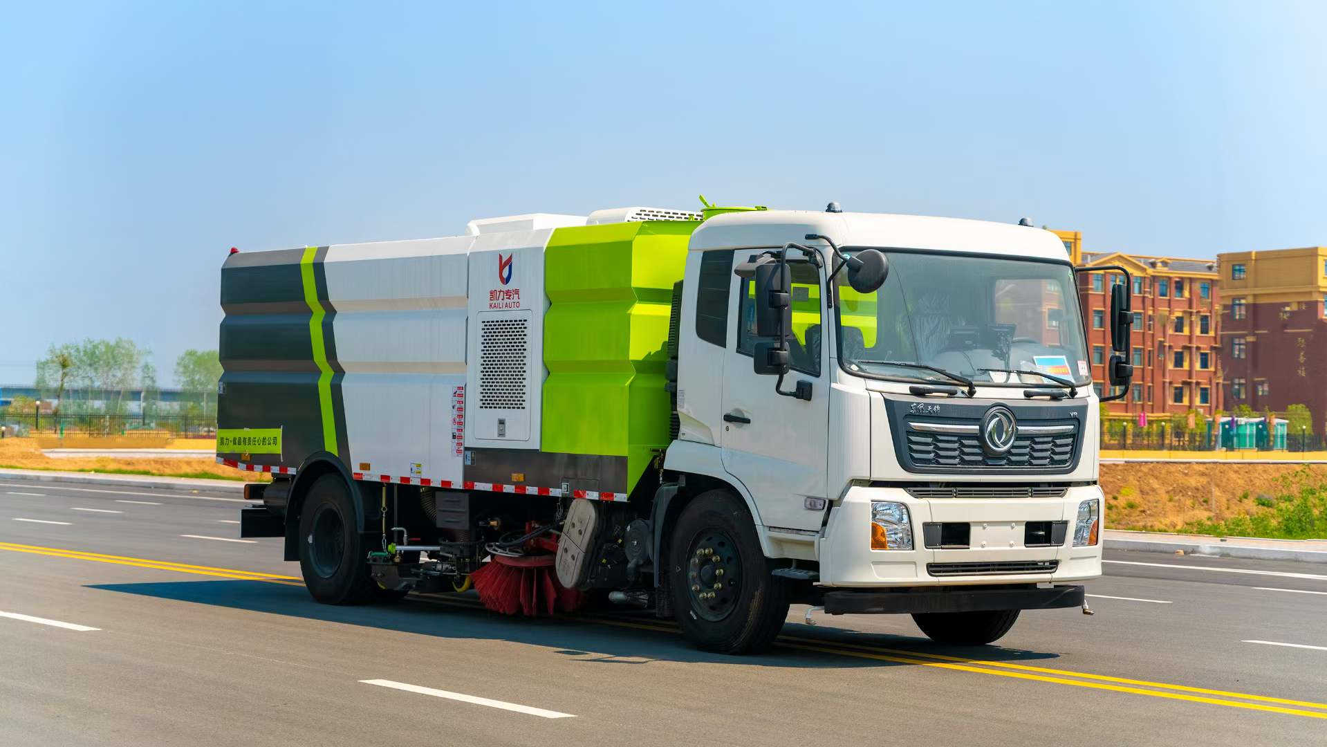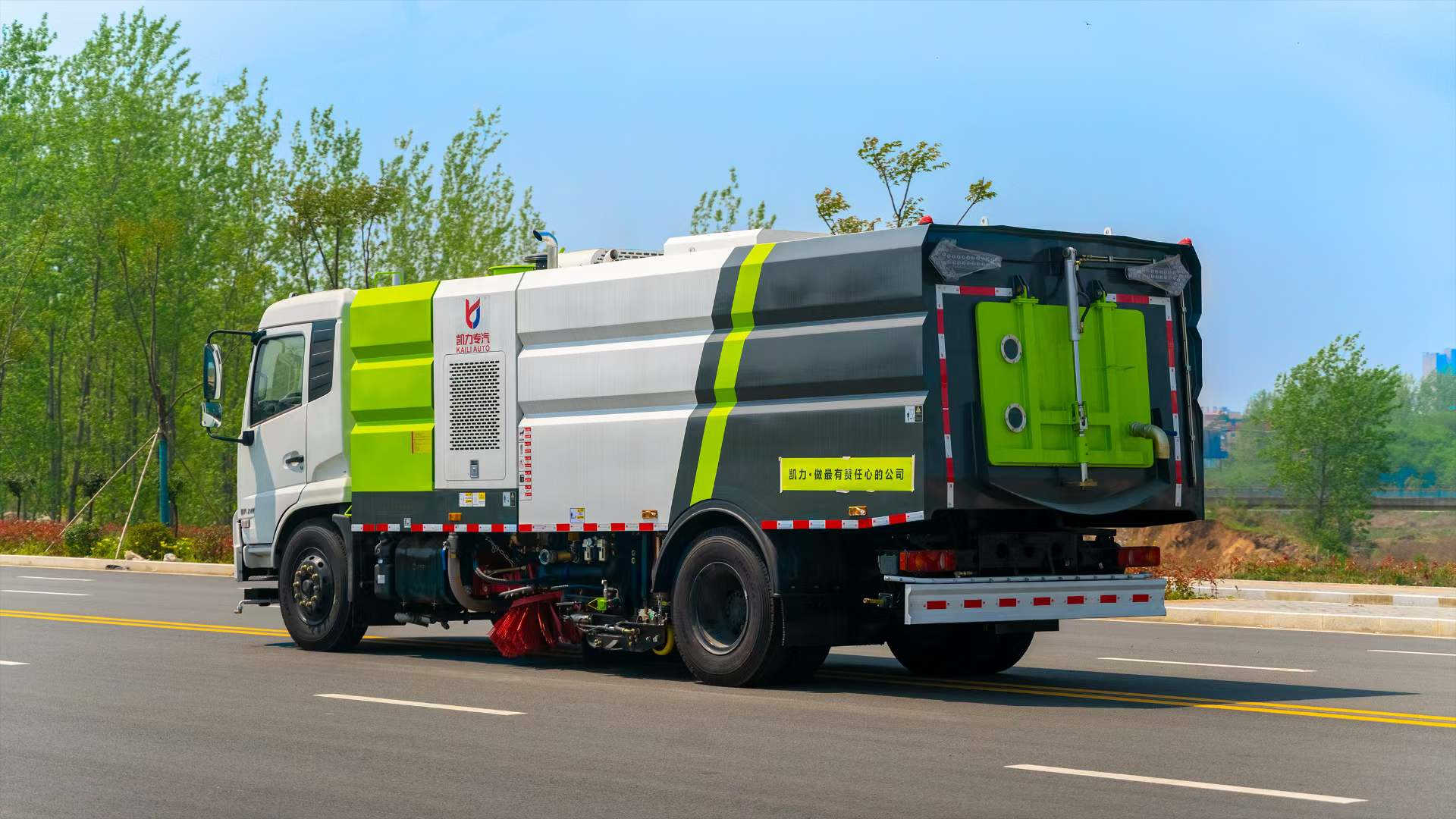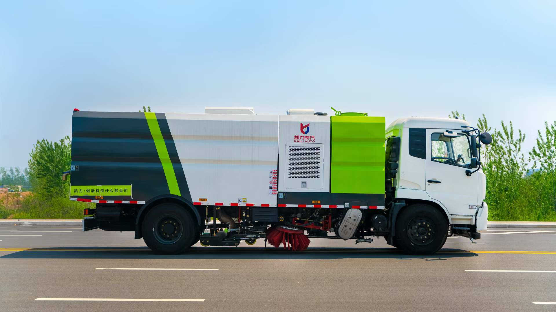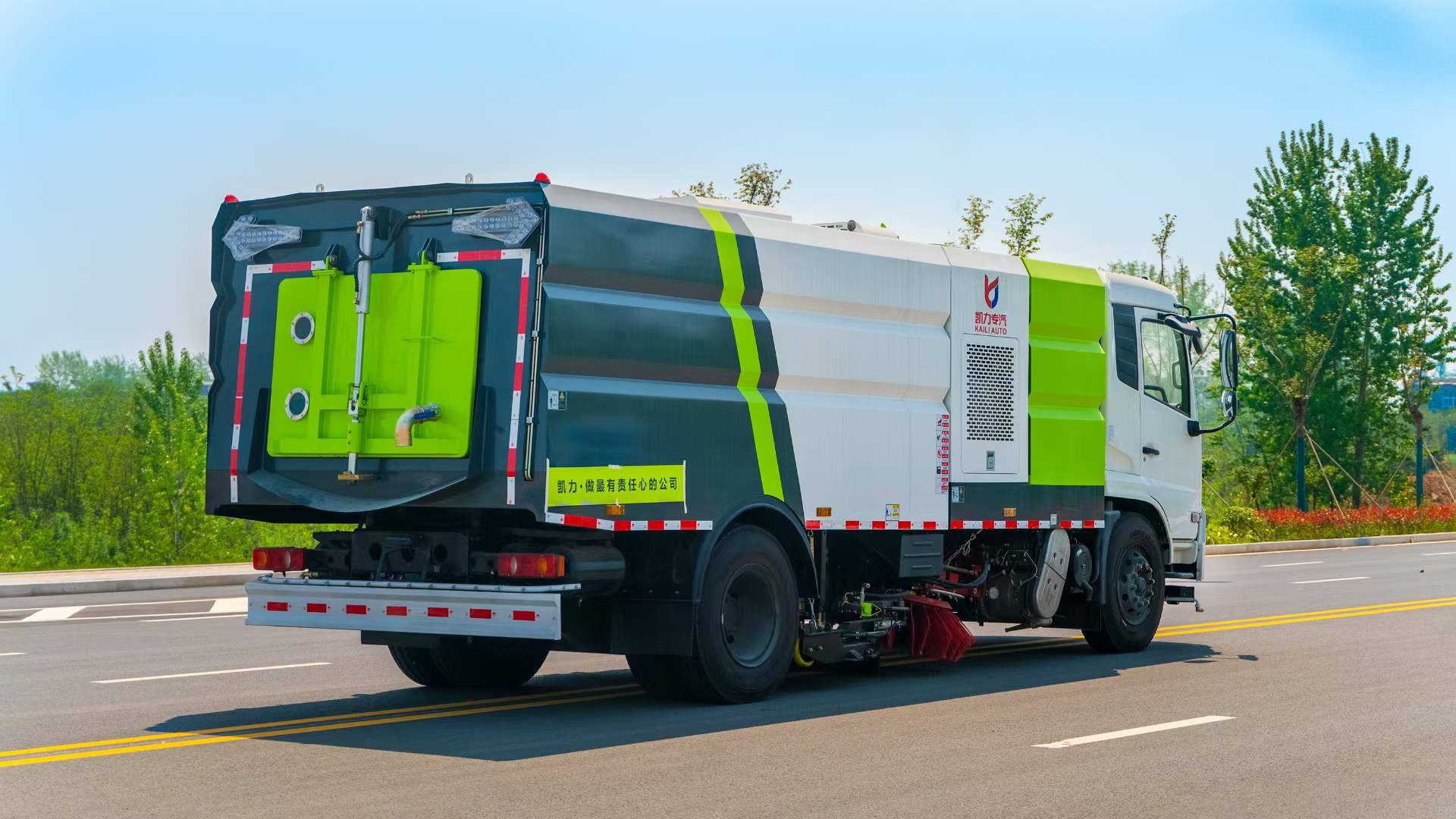 底盤電池提供動力,永磁同步電機驅動,可根據需要實時調速,取力操作與底盤行駛系統無任何關聯,用車體驗感極佳。中置2掃盤,三洋馬達,GTM高壓水泵,皖液齒輪泵,海普瑞斯液壓油缸,萬向高壓路沿清洗,免維護離心式風機,不銹鋼水箱、垃圾箱,不銹鋼高壓管路、施耐德控制開關、美國傳感器、尾部LED箭頭燈;垃圾箱、水箱均帶防溢或低水位報警裝置,倒車及洗掃狀態室內監控系統,尾部帶電控操作系統,15M高壓沖洗卷盤,最大清掃寬度3.5m,高壓沖洗21m。  電氣系統由底盤車電路專用工作裝置操作控制電路組成。